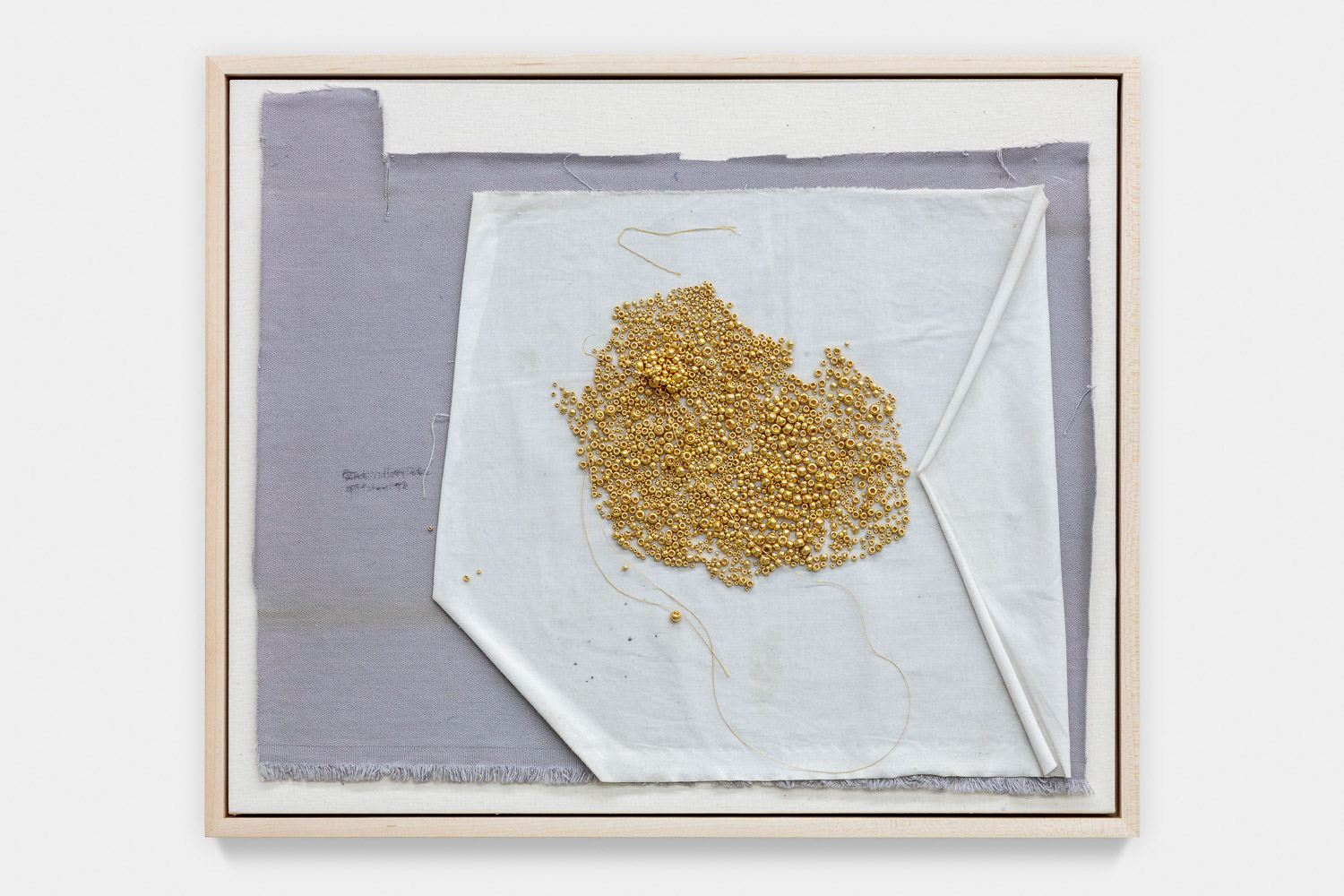 In Medias Res 12:22, 2017, glass beads, thread, ink on naturally stained fabric on wood, 15.25 x 18.25 x 1.5 inches (38.73 x 46.35 x 3.81 cm) (framed)