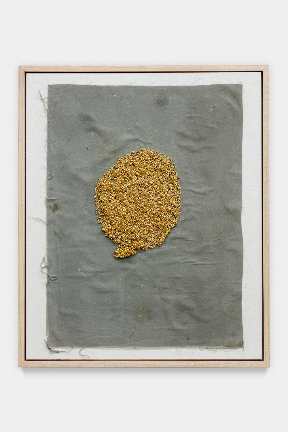 In Medias Res 8:40, 2017, glass beads, thread on naturally stained and wrinkled fabric mounted on wood, 19.875 x 15.125 x 1.5 inches (50.48 x 38.41 x 3.81 cm) (framed)