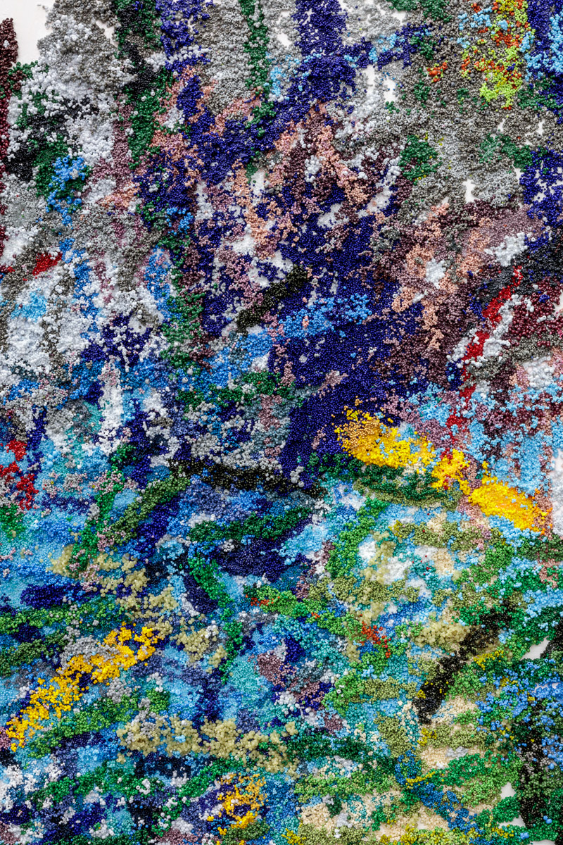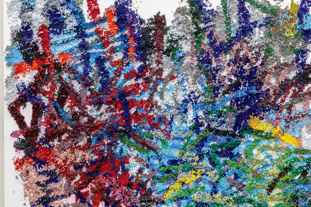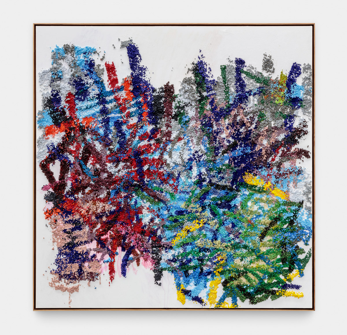 Denouement, 2024, glass beads and oil paint on stretched canvas with artist’s frame, 51.25 x 51.25 x 2.5 inches (130 x 130 x 5.7 cm)