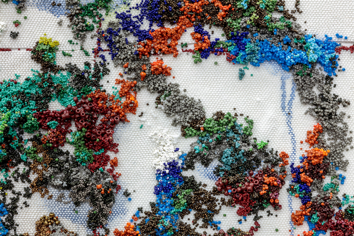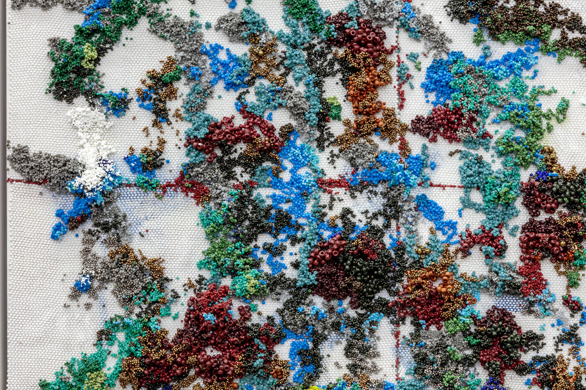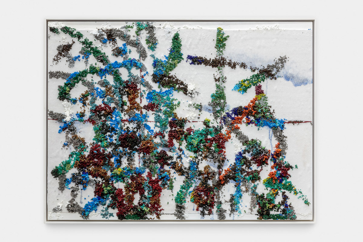 Epitaph, 2024, glass beads and oil paint on stretched canvas with artist’s frame, 31 x 41 x 2 1/4 inches (78.7 x 104.1 x 5.7 cm)