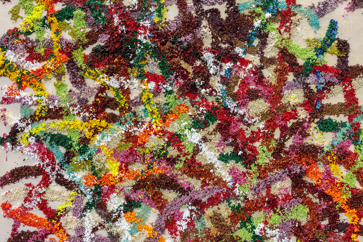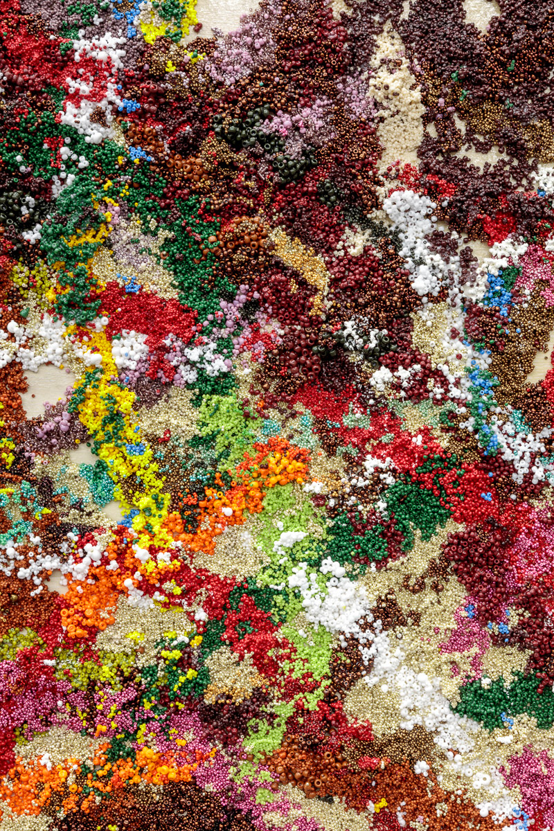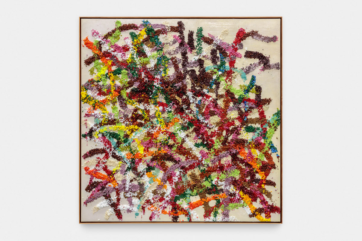 Gravity's Rainbow, 2024, glass beads and oil paint on stretched canvas with artist’s frame, 52 1/8 x 52 1/8 inches (132.4 x 132.4 cm)