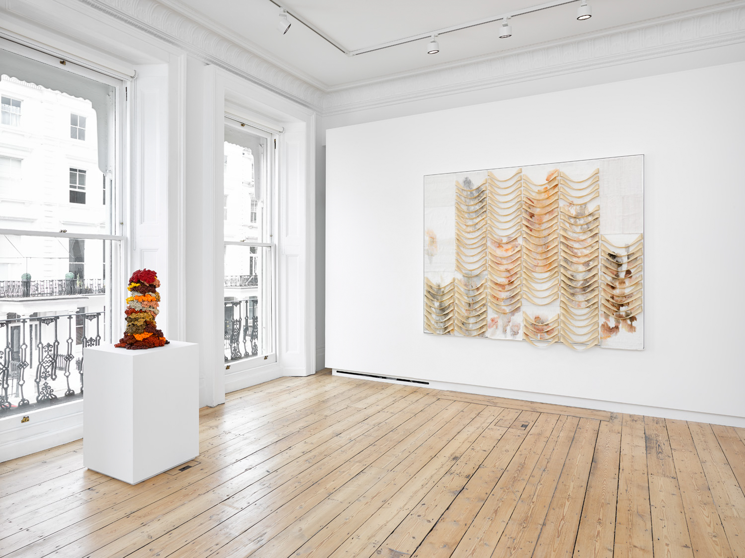 Summer's End, 2018, glass beads and thread mounted on steel frame, 17.3 x 17.3 x 2.4 inches (44 x 44 x 6 cm), Photocredit | Jack Hems